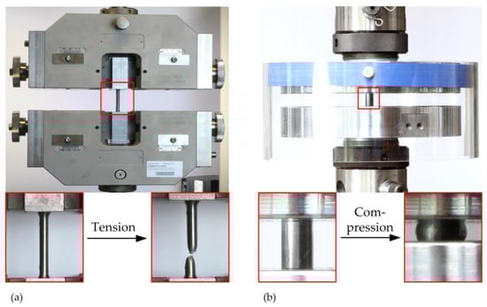 (a) Test setup for the characterization of the mechanical properties under tensile (a) and compressive load (b). (a) In the tensile tests, the specimen elongation was recorded by a video extensometer; (b) Highly polished compression plates applied uniaxial compression until the maximum of 101.9 kN compressive load was reached.