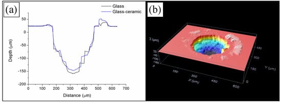 In the first place, W-TCP eutectic glass and glass-ceramic samples were machined to assess the interaction between the laser radiation at 532 nm in the nanosecond range and the samples, and to determine the ablation rates. For this purpose, samples were processed around the focal plane moving the surface of the samples upwards and downwards up to 3 mm out of focus. The sign convention taken was as follows: negative when the sample was moved upwards, i.e., the focal plane was placed below the surface, and positive when it was moved downwards, i.e., the focal plane was above the surface. To study the machining efficiency and ablation yields, the machining process was carried out by processing the samples for 20, 40 and 60 iterations with the experimental conditions mentioned in Section 2.2. As an example, Figure 1 shows the profiles of the machined depth achieved in a 300 µm diameter crater for both the glass and the glass-ceramic samples for a reference position of −2 mm after iterating the laser processing 60 times, Figure 1a, and a topography of the machined surface, Figure 1b. For these conditions, the maximal depths attained were 157.25 ± 4.21 µm and 134.99 ± 6.93 µm for the glass and the glass-ceramic, respectively. The profiles showed that, due to the brittle nature of the samples, the material was not removed homogeneously, giving rise to abrupt changes of depth. In addition, the topography revealed that part of the ejected material was deposited on the surface. Figure 2a shows the machined depth achieved around the focal plane for both samples and for the case of 60 iterations, and Figure 2b the machined depth achieved (solid lines) and the average depth (dotted lines) as a function of the number of iterations. In Figure 2a it can be observed that the maximal machined depth was achieved by placing the sample out of focus, specifically at −2 mm. As previously reported, the machined depth and the removed volume depend on the laser machining method [28,32,33,34]. When the samples were machined by using the percussion technique—i.e., delivering the whole laser pulses over the same area—the maximal machined depth and removed volume were achieved when the surface of the sample was placed at the focal plane. However, for machining large areas, it is necessary to deflect the laser beam over the sample or to move the sample by using a translation stage if the laser system is not equipped with a scanning head. It was shown that, in this machining method, the maximal machined depth and removed volume were achieved by placing the sample out of focus [32,33,34]. As shown in Figure 2a, this phenomenon also holds for the case of these eutectic glasses and glass-ceramic samples. It is worth mentioning that the machined depth for the glass-ceramic was slightly lower than for the glass, which is related to the higher hardness of the glass-ceramic, 495 HV, versus 458 HV for the glass. It was also demonstrated that there exists a close relation between the ablation yields and the material hardness, such that the harder the material is, the lower the ablation yields [32,34]. Figure 2b depicts that, although the machined depth increased with the number of iterations, the average depth decreased for a number of iterations higher than 40. In particular, for the glass sample, it decreased from around 3 µm for 20 and 40 iterations to 2.62 µm for 60 iterations, and for the glass-ceramic sample, from around 2.75 µm to 2.25 µm. Therefore, the surface to be machined had to be readjusted after 40 iterations for an optimal machining process. For these conditions, the removed volume and the ablation yield were found to be 200 µm3/pulse and 340 J/mm3 for the glass and 183 µm3/pulse and 371 J/mm3 for the glass-ceramic sample. These ablation yields might be increased by using ultrashort laser pulses. During the ablation process in the nanosecond range, a plasma is created in the interaction zone. This plasma can shield the surface to be machined, hindering the ablation process [35].