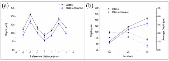 Machined depth achieved for the W-TCP eutectic glass and glass-ceramic samples around the focal plane (cero position) for 60 iterations (a) and machined depth (solid lines) and mean average depth (dotted lines) as a function of the number of iterations (b).