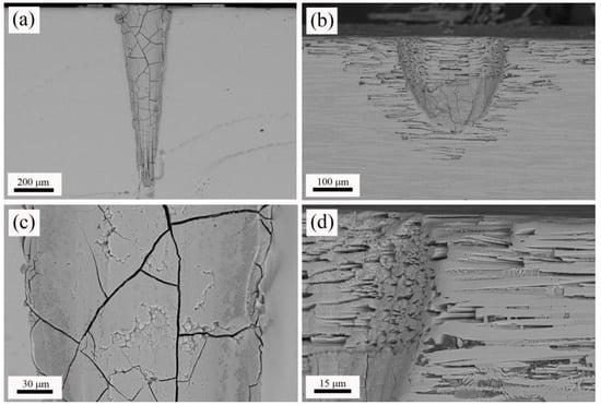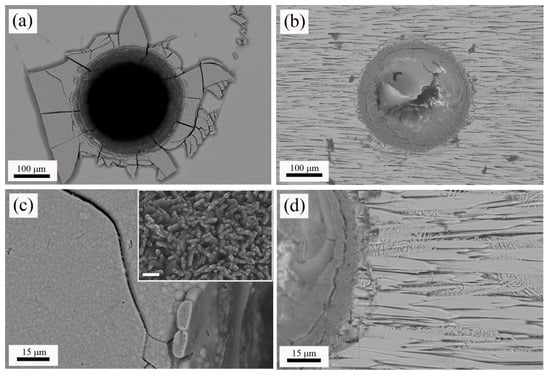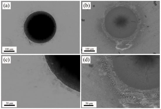 Next, W-TCP eutectic glass and glass-ceramic machined samples were characterized by means of SEM-EDX. Figure 3a,b shows top-view micrographs of the craters machined in the glass and the glass-ceramic sample, respectively. In both cases, the surroundings of the machined areas presented a heat-affected zone, HAZ, and deposition of the ejected material. The origin of the HAZ relies on the photothermal nature of the interaction between nanosecond laser pulses with matter [36]. Both Figure 3c,d shows these areas in detail. It is worth noting that the glass-ceramic sample presented a higher amount of deposited material than the glass sample. EDX analyses were carried out on both machined samples to evaluate whether the composition of the departing sample was modified. Table 2 shows that composition of both glass and glass-ceramic samples was close to the theoretical eutectic composition. Additionally, these compositional analyses indicated that the HAZ’s compositions were approximately the same as the departing materials.