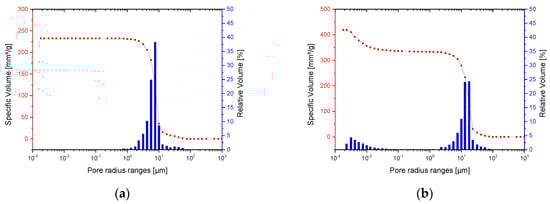 The ceramics (3 samples of each) were tempered at 105 °C for 24 h to ensure that no water was present in the samples. The test was then carried out in accordance with DIN 66133. For this purpose, the samples were transferred into a glass vessel and this was installed in the Pascal 140/440 porosimeter. The pressure control and evaluation were carried out by PASCAL software. The results from both measurements were then combined into a diagram by the software [40]. The SEM/ESEM images were taken with FEI Quanta 250 FEG (FEI, Hillsborough, OR, USA) and Philips ESEM XL 30 FEG (Amsterdam, The Netherlands). The EDX measurements were carried out on a Philips ESEM XL 30 FEG with EDX unit and the EDX measurements in Appendix A1 were carried out on a FEI Quanta 250 FEG with Oxford EDX unit. The measurement conditions were 10 kV accelerating voltage and 10 min measurement time (live time). A Keyence 3D Laserscanning Microscope (Keyence VK-X210) was used to measure the surface roughness. All experiments were carried out at room temperature. The uniaxial compression tests were carried out at a Zwick/Roell Z005 (Zwick/Roell, Ulm, Germany) materials testing machine with Test Expert II Software. A standard compression test was carried out with 1 N pre force and testing speed of 10 mm/min. Stop criterion was break or 20% length deformation. Origin 2016 Professional (OriginLab, Northampton, MA, USA) was used for all following statistical calculations.