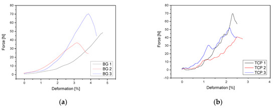 The results of the compression tests for the BG, β-TCP, 50/50 and 70/30 scaffolds are shown in Table 5. The original plot, produced by the Zwick “Test Expert II” software (Zwick Roell Group, Ulm, Germany), reported a maximum force higher than the true maximum force that the material could withstand. This was due to the presence of the large pore channels in the scaffolds: when the powder structure was compressed, the large pores closed, thus forming a more solid structure that provided greater resistance to the applied force. For this reason, the first peak in the resultant plot was taken to be the maximum force which the scaffold could withstand. Figure 6 shows the Force-Deformation curves for the different samples.