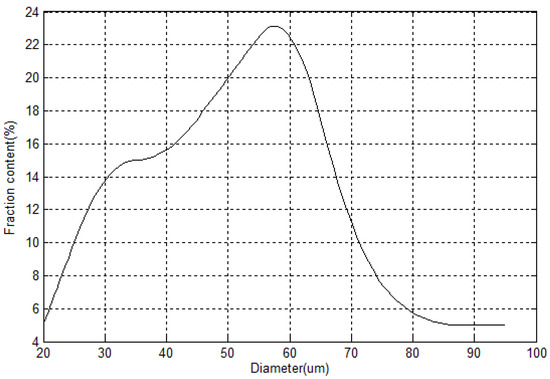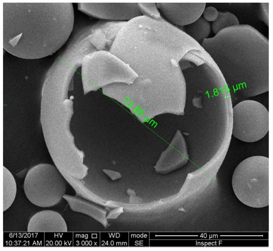 The manufacture of HGM involves complex hydrodynamic and chemical processes; it is impossible to make microspheres with identical diameter and wall thickness. In order to understand the insulation behavior of HGM better, which is closely related to its microsphere size and microstructure, typical scanning electron microscope (SEM) images of HGM involving full view and cross section are provided here. The observing experiment is conducted by using the FEI Quanta 250 FEG machine at Henan University of Technology. Figure 1 displays two SEM images of HGMs in different scales, which were fabricated by Sinosteel Maanshan New Material Technology Co., Ltd (Maanshan, China, www.glass-bubble.com). From Figure 1, it is clearly seen that the tiny bubbles are in perfect spherical shape, but their diameters are distributed in a certain range. Therefore, it is necessary to perform statistics of microsphere’s dimension. Figure 2 demonstrates the distribution of diameter of microspheres, from which it is observed that the size of microsphere mainly locates in the interval [30 μm, 70 μm]. Besides, the wall thickness of hollow microspheres is another interesting geometric factor. Figure 3 shows the cross section of a typical cracked microsphere. The clear hollow structure and homogeneous wall thickness is observed from this figure. Based on the measured value of each cracked microsphere, it is found that the wall thickness of the microspheres changes from 1.2 to 2.2 microns. However, it is interesting that the void content to the microsphere keeps nearly 85% unchanged, although the wall thickness of HGM increases with the increase of its diameter.