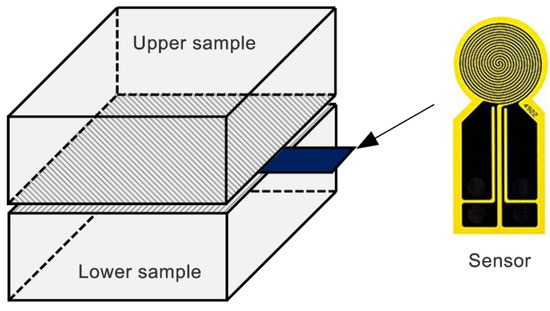 In this study, the TPS method proposed by Gustafsson [22] is used to measure the thermal conductivity of HGM powders. It has become an ISO standard (ISO22007-2) for rapidly and precisely measuring thermal transport properties of bulk materials [22,23]. The principle of the TPS method is based on the introduction of plane sensor element that acts both as dynamic temperature sensor and heat source. This plane sensor usually consists of a double spiral heating element made of thin pure nickel foil (about 10 μm) and two thin insulating layers made of Kapton (about 70 μm). In the practical measurement, this plane sensor should be placed between two identical samples with both sensor faces being in contact with the two sample surfaces, as depicted in Figure 5.