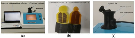 In the experiment, the thermal conductivity is measured by DZDR-S Thermal Constants Analyzer based on the TPS technique, provided by Dazhan Institute of Electromechanical Technology, Nanjing, China. As shown in Figure 6a, the equipment typically consists of an indicator that is used for adjusting the voltage, a computer with testing software and two different sensors (see Figure 6b), which can be used in different measuring ranges of thermal conductivity, 0.005–0.02 W/(mK) and 0.02–300 W/(mK), respectively. The radii of the nickel foil in the two sensors are 7.5 mm and 15 mm, respectively. The thermal conductivity of microsphere powder can be measured using the two sensors. A black special container shown in Figure 6c is used to provide an approximate closed and insulated environment for the powder in it. Besides, as seen in Figure 6c, there is a thin slot in the wall of the container to let the sensor pass through it and contact to the powder. A relatively small constant force required for the contact method, i.e., 10 N, is applied via a matched weighted plug provided by the manufacturer to make the powder more compact and simultaneously to avoid fracture of the microspheres [31].