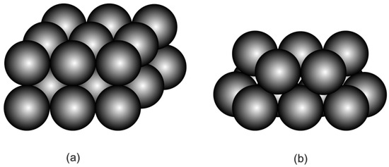 Assumed configurations of HGMs in the powder: (a) the periodic cubic close-packing and (b) the periodic hexagonal close-packing.