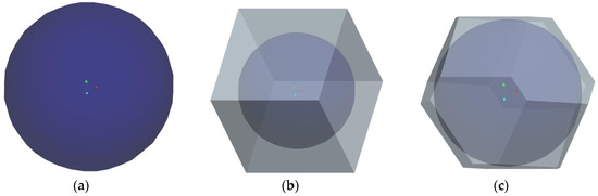 It is assumed that HGMs in the powder are mainly distributed in three different configurations. The first configuration is built by thoroughly neglecting air voids in the powder, so that a single HGM can be considered as stacking element for such an extreme case. The second configuration is the cubic close-packing of HGMs in the powder (see Figure 7a) so that a cubic stacking element, including a HGM and surrounding air void can be taken from the powder for consideration. The third configuration is the hexagonal close-packing of HGMs in the powder (see Figure 7b), so that a truncated octahedron stacking element including a HGM and surrounding air void is considered as representative unit cell of this kind powder. The corresponding HGM stacking elements for the three distribution assumptions are shown in Figure 8. Different to the single HGM stacking element, both the cubic HGM stacking element and the truncated octahedron HGM stacking element introduce external air voids surrounding the centered HGM. Accordingly, the external air volume fraction to the stacking element is 0% for the single HGM stacking element, 47.7% for the cubic HGM stacking element and 21.9% for the truncated octahedron HGM stacking element, respectively. Our aim is to determine their thermal conductivity in this section.