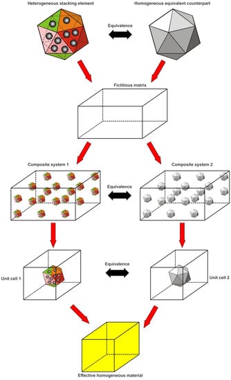 Evidently, the three stacking elements listed above typically have irregular shapes and heterogeneous microstructures, and thus it is difficult to directly measure the thermal conductivity of them. But, we can do this through numerical approaches. There are many models for evaluating effective materials properties of heterogeneous materials [32,33,34]. In this paper, a three-dimensional two-step hierarchical computational method is proposed to predict the effective thermal conductivity of the three particular stacking elements described in Section 4.1, and the basic procedure of it is described in Figure 9 for a general heterogeneous stacking element. In Figure 9, the two equivalent fictitious composite systems (system 1 and system 2) are respectively established by periodically embedding the interesting heterogeneous stacking element and its homogeneous equivalent solid counterpart as fillers into the same fictitious matrix material with same filler volume fraction. The stacking element and its equivalent counterpart has the same outermost shape and dimension. If the periodic cubic pattern is assumed for the distribution of the interesting stacking element and its equivalent counterpart in the fictitious matrix material, two corresponding cubic composite unit cells (Unit cell 1 and Unit cell 2) can be, respectively, taken out from the two fictitious composite systems for our study. The Unit cell models are based on the most basic and smallest cell that can be repeated periodically to form the entire composite medium, so that the physical properties of the unit cell represent the properties of the entire composite material [24,28,35,36]. In the present method, the two unit cells can be modelled by the standard finite elements to obtain the temperature and heat flux distributions in them. Finally, the equivalency of the fictitious composite systems can be used to bridge the stacking element and its equivalent counterpart to determine the value of the whole thermal conductivity of the complex filler.