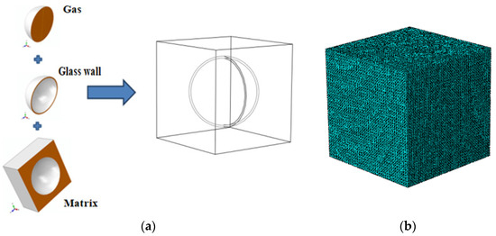 In order to illustrate the detailed procedure of the present method, we take the stacking element (a) in Figure 8 as an example, and the stacking elements (b) and (c) can be similarly treated. Table 2 shows the geometrical dimensions of HGM and the thermal properties of involved material phases in the simulation. It is worth noting that the wall thickness in Table 2 is evaluated by 85% of the void content to the microsphere, as discussed in Section 2. Besides, the thermal conductivity of the solid wall composed of CaO-SiO2 system is approximately given through the rule of mixture as 1.03 W/(mK) [37], which is close to that of glass [38]. The thermal conductivity of matrix material is assumed to be 0.93 W/(mK), unless specially stated. In the analysis, the fictitious matrix material is just introduced in the computational method to form new composite systems, thus the predicting results of the microsphere should theoretically be independent of the choice of matrix material. Additionally, it is assumed that each material phase is isotropic and homogeneous.