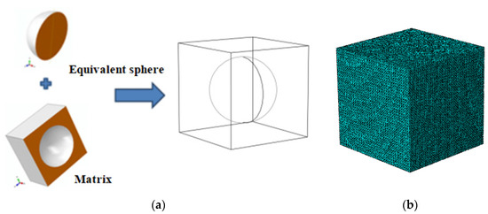 In practical analysis, it is assumed that the outmost radius R of the HGM keeps unchanged and the side length L of the unit cell can be calculated from Equation (3), with a given value of the microsphere volume fraction to the composite unit cell, i.e., 10%, 20%, 30% and 40%. Figure 10a shows the established 3D unit cell model with 20% HGM volume fraction and Figure 10b displays the finite element discretization with a total of 156,772 elements (DC3D10) and 228,117 nodes that are generated by ABAQUS. In order to achieve accurate and convergent results, a relatively high mesh density is employed here, such that the maximum relative difference in the predicted thermal conductivity between two different meshing schemes is less than a specified tolerance, i.e., 0.1%.