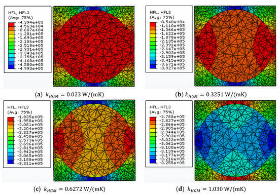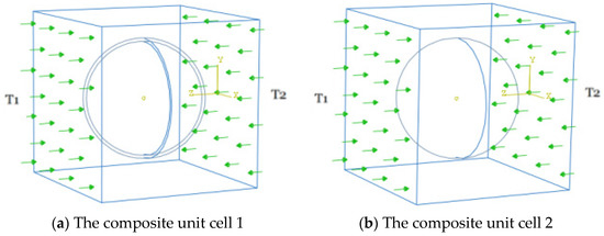In order to determine the effective thermal conductivity of the two composite systems related to the HGM and its equivalent, two different constant temperature boundary conditions and () are applied on the opposite surfaces of the unit cell, i.e., the two surfaces perpendicular to the axis, to make thermal energy flow through the unit cell from one surface to another, as shown in Figure 12. The remaining four surfaces are assumed to be insulated. Based on the constitutive formulation (5), the effective thermal conductivity of the composite system can be given by [42,43]