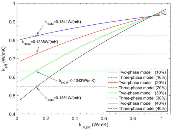 Figure 15 indicates the variation of the effective thermal conductivity of the two-phase composite system with respect to for various microsphere volume fractions. To obtain the thermal conductivity of the single HGM element, the equivalent results from the three-phase composite system are also plotted in Figure 15 for each microsphere volume fraction (see the straight lines in Figure 15). The intersection of the straight line from the three-phase composite system and the curved line from the two-phase composite system gives 0.1341 W/(mK), 0.1335 W/(mK), 0.1343 W/(mK), and 0.1351 W/(mK), respectively. As expected, the thermal conductivity of the HGM is not sensitive to the microsphere volume fraction to the unit cell, and the almost same result is obtained for different microsphere volume fractions. Theoretically, one can arbitrarily choose any microsphere volume fraction for the computation analysis. However, the strong interaction between the cell boundary and the microsphere may exist for large microsphere volume fraction, hence it is suggested to employ the relative small or medium microsphere volume fraction in the practical computation. Here, the average value 0.1343 W/(mK) is used as the approximated thermal conductivity of the single HGM.