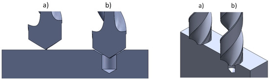 According to Figure 3, it is obvious that in the workpiece with the pre-center drill hole, engagement starts with the initial cutting edge on the cutter. Without using a pre-center drill hole, the initial point of engagement is seated on the chisel edge. The cutter may therefore slip on the workpiece and consequently angular drill holes may be generated. In addition, tool break may be observed in the case of using brittle cutters (such as WC).