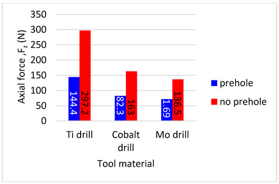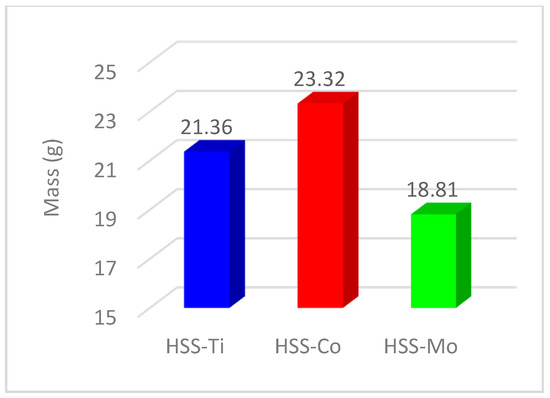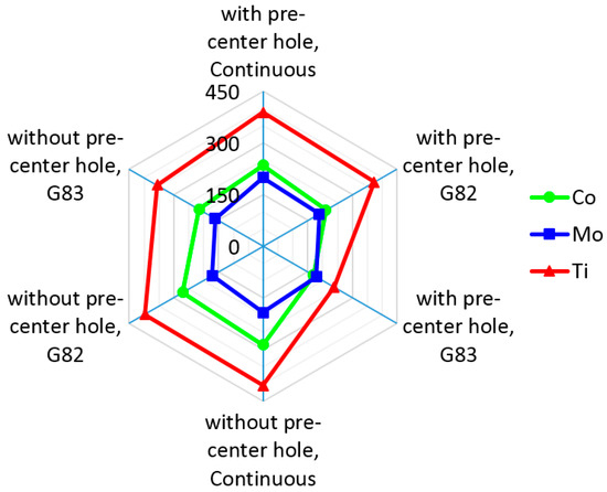 Figure 4 illustrates that HSS-Ti coated has the highest thrust force followed by HSS-Co and HSS-Mo. This trend was also observed in all cutting strategies. The differences between force values are associated with the difference in friction coefficient and edge (sharpness, the quality of coating, coating material, and cutting-edge angles) [30,31,32]. In a drilling operation, cutting-edge preparation is more important than the friction coefficient [33,34,35]. The higher cutting force for HSS-Ti-coated tools is also related to the coating material on the cutter. Ti has low thermal conductivity and higher temperature in machining when using a Ti cutter, which is reported in the literature [36,37]. Moreover, using a Ti cutter generates higher temperature and with respect to the high affinity of this alloy to chemically react with most of the materials at higher temperatures tool wear was observed in the cutting edges and consequently higher cutting forces were also observed [37,38,39].