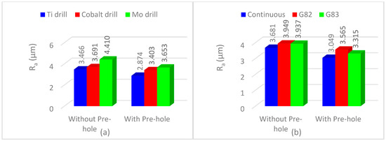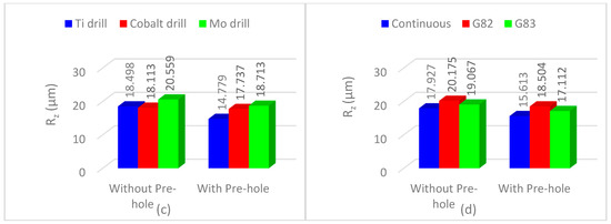 Figure 6b,d illustrates that using the continuous strategy generated the best surface quality followed by G83 and G82. In non-continuous strategies, the cutting edges have negative effects on the surface quality in subsequent drilling passes. Therefore, a small cutting process occurs in subsequent passes and generates rougher surfaces. This phenomenon occurs even when the spindle or drill bit has a small imbalance.