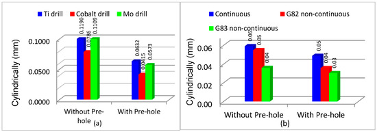 G83 was observed to be the best drilling strategy to increase cylindricity followed by the G82 and continuous modes (Figure 8b). The reason can be related to the higher temperature in continuous mode and the better cooling process for the G82 and G83 strategies. Higher temperatures and thermal stresses, notably during drilling, affect dimensional deviations and cylindricity.