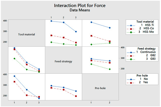 An interaction plot for cutting conditions versus cutting forces is shown in Figure 10. The HSS-Ti-coated drill generates the highest cutting force, and the reason for this is related to the difference in edge (coating material and cutting edge angles as well as the sharpness and quality of the coating) and friction coefficient [25,26,27]. Another reason for the higher cutting force when using HSS-Ti-coated is associated with the coating material on the cutter. Ti has low thermal conductivity and generates a higher temperature in metal cutting [31,32]. The high affinity of Ti to chemically react with most of the materials leads to an increase in temperature and tool wear and subsequently higher cutting forces [32,33,34]. The interaction of tool material and feed strategy shows that the generated force has a decreasing trend for HSS-Ti, HSS-Co, and HSS-Mo. In G83, less force was observed, which is associated with two possible reasons: (I) a higher cooling time for the drill bit due to its moving back to the reference point; and (II) increasing the depth of the hole leads to a longer movement of the drill bit toward the reference point, increasing the cooling time and subsequently decreasing the cutting force.