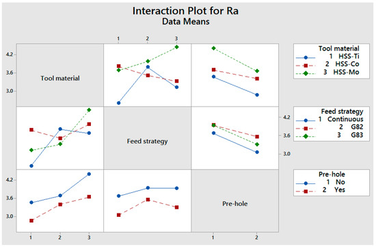 As mentioned in previous sections, vibration and the contact portion of side-cutting edges are important factors in the quality of the surface roughness. In addition, roughness increases when the end of the chisel edge is in contact with the workpiece. The interaction of tool material and the feed strategy in Figure 11 shows that the roughness when using HSS-Co is less than when using HSS-Mo and HSS-Ti, which is related to the higher mass and damping. Generally speaking, the differences in the value of roughness are quite small when using different cutting material and the feed strategy.