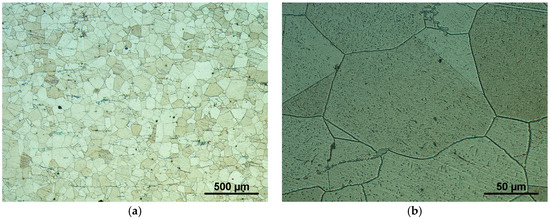 Figure 1. Sanicro 25 austenitic microstructure, etched in hydrochloric acid and hydrogen peroxide water solution, magnification (a) 50× and (b) 500×.