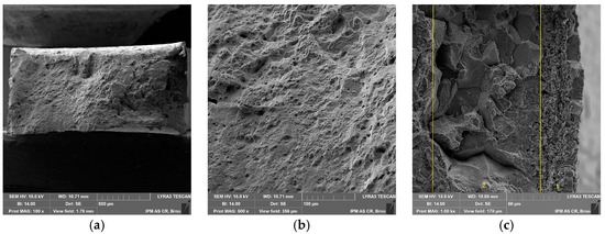 Figure 12. SEM fractographs of miniature creep specimen (σ = 300 MPa, T = 700 °C, tr = 60.2 h): (a) magnification 25×; (b) fracture surface 40×; (c) fracture surface 500×.