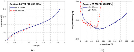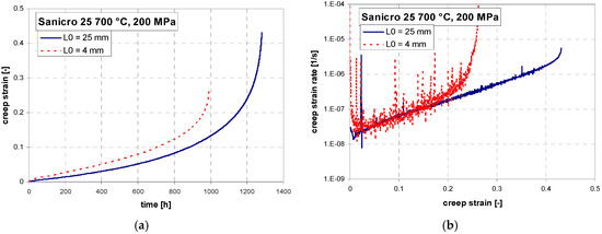 Figure 8. (a) Creep curves; (b) creep rate vs. strain relations of Sanicro 25 at 700 °C, 200 MPa.