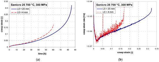 Figure 7. (a) Creep curves; (b) creep rate vs. strain relations of Sanicro 25 at 700 °C, 300 MPa.