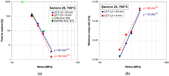 Figure 9. (a) Time to rupture dependence on stress; (b) minimum creep rate dependence on stress.