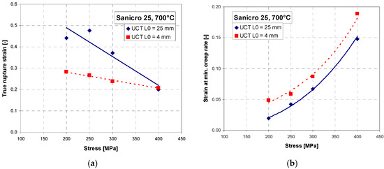 Short-term creep testing was performed on both specimen geometries at 700 °C. The creep curves and strain rate dependence on creep strain for stress between 200 to 400 MPa are shown in Figure 6, Figure 7 and Figure 8. Except for the test at 200 MPa, all of the tests were conducted above the yield strength of the steel. The initial strain obtained instantly after loading was subtracted, so only creep strain is plotted in the creep curves. It can be seen from Figure 6a, Figure 7a, Figure 8a and Figure 9a that for all tests the time to rupture was lower for miniature specimens. Figure 9a also shows that the time to rupture at 200 MPa is well comparable with results obtained in [24] and [27]. The creep strain rate (derivative of creep strain) is shown in Figure 6b, Figure 7b and Figure 8b. There was a higher noise for miniature specimens compared to standard specimens. This is attributed to the specimen length and given sensitivity and noise of the induction sensor recording the deformation. The stress exponent n is approximately 8 for standard specimens and 7 for miniature specimens, as shown in Figure 9b. The rupture strain dependence on stress is plotted in Figure 10a. It is shown that the rupture strain steadily increases with decreasing stress. For miniature specimens, it increased less than for standard specimens. This can be attributed to small gauge length. The strain at minimum creep rate dependence on stress is plotted in Figure 10b. It is systematically higher for miniature specimens compared to standard specimens. Creep rupture time of the miniature specimens was in all cases approximately 30–40% lower compared with standard specimens, and the difference slightly decreased with lower stress. This represents a certain level of conservative factor if the miniature specimen testing method is applied instead of the standard test.