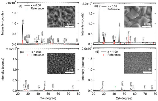 X-ray diffraction (XRD) patterns for ~9000 Å thick IGS films of different alloy composition values x. The XRD patterns are consistent with expectations for (In1−xGax)2Se3 obtained from MDI JADE: (a) PDF # 97-064-0476; (b) PDF # 97-063-4424; (c) PDF # 97-009-2068 and (d) PDF # 97-007-6754. The scanning electron microscopy (SEM) images for the same IGS films are shown in the insets. These samples from the composition series were also studied by real time spectroscopic ellipsometry (RTSE) as described in Section 3.1.