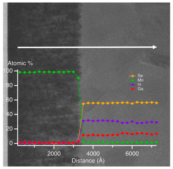 Cross-sectional transmission electron microscopy (TEM) image and elemental line profiles by energy-dispersive X-ray spectroscopy (EDS) for a Mo/IGS structure with IGS composition x = 0.31 highlighting the interface region. The EDS measurements were performed across the interface every 250 Å in depth.