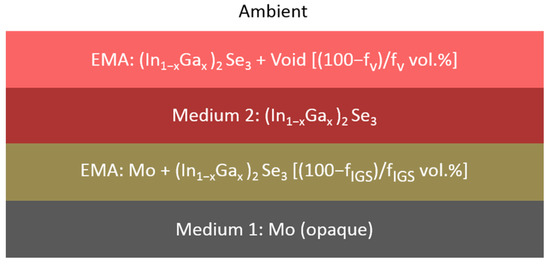 Three-layer structural model used for the analysis of RTSE data acquired in the later stages of the depositions for IGS thin films prepared under conditions that simulate the stage I process of CIGS co-evaporation. In this later stage model, it is assumed that the 50 vol % voids in the surface roughness on the uncoated Mo film are completely filled by the deposited IGS material.