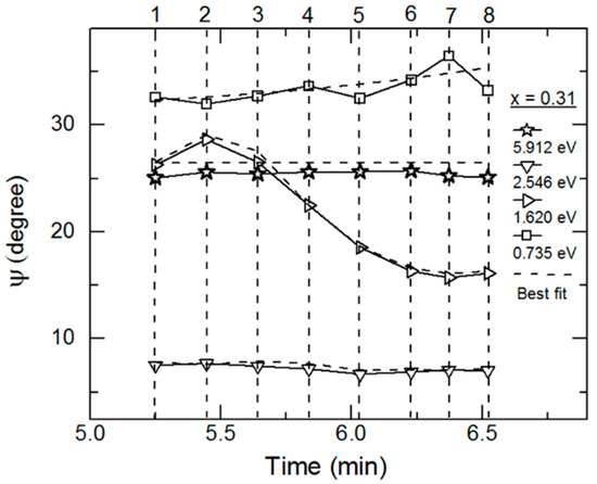 As an example of the fitting achieved continuously versus time in the multi-time analysis, RTSE data in ψ at the specific photon energies of 0.735, 1.620, 2.546 and 5.912 eV are plotted together with the best fit results in Figure 4 for the IGS deposition with x = 0.31. Deviations between the data and best fit in Figure 4 occur not only due to noise in the data (particularly at the lowest and highest photon energies of the range) but also due to limitations in the accuracy of the single bulk layer model and the b-spline dielectric function. Figure 5 shows the final parametric (ε1, ε2) spectra obtained by fitting the inversion results near the center at t* of the multi-time analysis ranges using the oscillator model, which includes single CP and TL oscillators. The resonance energy parameter of the CP oscillator represents the fundamental bandgap Eg1. In contrast, the bandgap of the TL oscillator described as a Tauc gap Eg2 serves as a low energy absorption onset for a higher energy Lorentz oscillator with a resonance energy of E02. The CP and TL oscillators are also defined by their individual amplitudes (A1, A2) and their broadening values (Γ1, Γ2), respectively. The phase and exponent of the bandgap CP oscillator are fixed at 0° and 0.5, respectively, and the constant contribution to the ε1 spectra is fixed at unity.