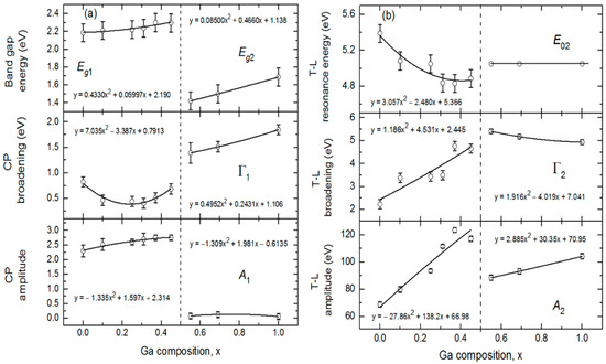 Figure 6 shows the variations of the bandgaps, resonance energies, amplitudes and broadening parameters of the CP and TL oscillators versus alloy composition x over the full range of x. The In- and Ga-rich sides of IGS series have different oscillator characteristics and trends with composition as reflected in Figure 6. For x ≤ 0.45, the bandgap CP oscillator is clearly visible in (ε1, ε2) at Eg1 ~ 2.2–2.3 eV and exhibits a wide minimum in the broadening parameter Г1 centered in the range x = 0.20–0.30. For x ≤ 0.45, the Tauc gap associated with the high energy TL oscillator is fixed at the bandgap CP energy in order to prevent absorption associated with the TL oscillator from appearing below the bandgap CP energy. In contrast to the behavior for x ≤ 0.45, the amplitude of the CP oscillator is essentially zero for x ≥ 0.56, meaning that the signature of the fundamental bandgap disappears from the optical response for the Ga-rich alloys. In its place, a very gradual low energy absorption onset is observed that can be simulated with the low energy tail of the TL oscillator with a Tauc gap that now controls the absorption onset due to the absence of the CP oscillator. This gap Eg2 increases from 1.42 to 1.69 eV as x increases from 0.56 to 1.00. In the final analysis for x ≥ 0.56, the Lorentz oscillator resonance energy associated with the TL is fixed at E02 = 5.05 eV, an average obtained when all TL parameters are varied for the three samples. This was done to stabilize the fit and obtain a systematic variation in x for the other TL parameters for x ≥ 0.56.