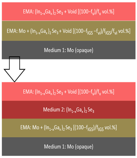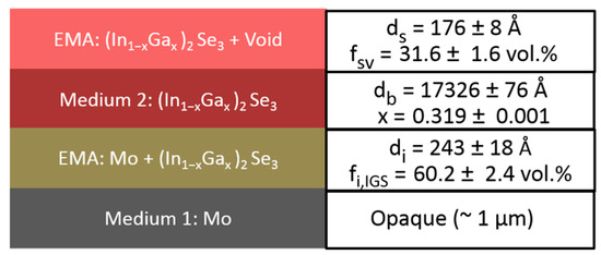 The first set of multi-time analysis procedures was applied to RTSE data collected on IGS films fabricated with different Ga contents, x, on Si/SiO2/Mo substrates. The goal is to determine simultaneously the structural evolution and the (ε1, ε2) spectra of the bulk layer after it has stabilized in the later stage of deposition. In this later stage of deposition, it is assumed that the voids in the underlying Mo surface roughness layer have been completely filled by IGS material, yielding an interface roughness layer with the same thickness as the surface roughness layer on the uncoated Mo. The model applied in this analysis consists of five media and three layers, as shown in Figure 3, including (i) an opaque Mo film as a substrate, (ii) the Mo/IGS interface roughness layer arising from the roughness on the Mo surface, (iii) the uniform IGS bulk layer, (iv) the IGS surface roughness layer and (v) an ambient medium of vacuum. For these analyses, the Mo/IGS interface layer thickness was fixed at a value deduced from a measurement of the Mo surface roughness thickness at room temperature prior to substrate heating and deposition, with values being in the 69–88 Å range. After the 50 vol % voids of the interface layer are completely filled by depositing IGS, the contents of the two materials in this interface layer are assumed to be 50/50 vol % Mo/IGS. The (ε1, ε2) spectra of the interface and surface roughness layers are determined by the Bruggeman effective medium approximation (EMA) as indicated in Figure 3. The Mo/IGS interface roughness thickness of 75 Å, as deduced optically for IGS with composition x = 0.31, can be compared to the peak-to-valley result of 200–300 Å from the TEM of Figure 2. A large difference is possible since it has been found that the roughness thickness deduced by SE analysis is 1.0–1.5 times the root mean-square roughness on semiconductor and metal surfaces as obtained by atomic force microscopy [23,25].