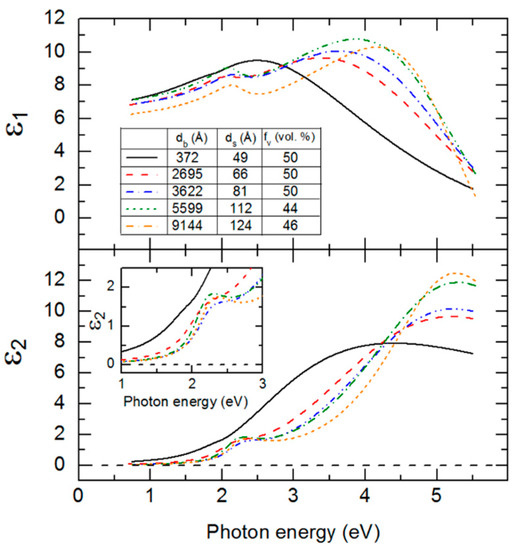 The structural parameters of Table 4 including db, ds and fv deduced at t* are used in an inversion procedure to extract the (ε1, ε2) spectra from the (ψ, Δ) spectra at t*. Such inversions at the five center times in Table 4 lead to a series of (ε1, ε2) spectra at different bulk layer thicknesses. Each set of (ε1, ε2) spectra obtained by inversion is fitted assuming the same parametric expression that was applied for the IGS composition series within the narrow 3500–4100 Å range of thickness. In addition to the expression, the constraints on the parameters in the analyses were the same as well. The best fit parametric forms of the (ε1, ε2) spectra of IGS for the different bulk layer thicknesses of Table 4 are presented together for comparison in Figure 9.