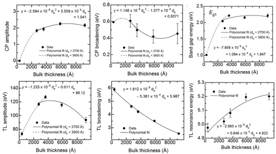 Among the ten parameters that could be varied, namely five for the CP oscillator, four for the TL oscillator and the constant ε1∞, only six are varied. The CP phase and exponent are fixed at 0° and 0.5, respectively and ε1,∞ is fixed at unity. In addition, the TL bandgap energy is equated to the CP resonance energy. The best fit variable parameters in the analytical expression for these (ε1, ε2) spectra are plotted versus db at t* in Figure 10. In order to quantify the observed thickness effects, polynomial functions describing the dependence of each variable oscillator parameter on bulk layer thickness were obtained in as many as two segments. The resulting polynomial functions associated with each parameter, shown by the lines in Figure 10, are summarized together in Table 5.