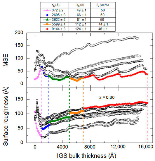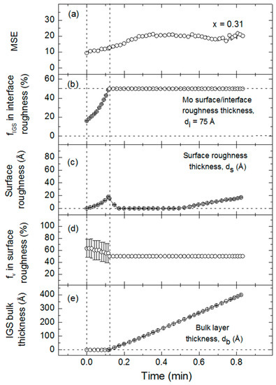 Figure 13 shows the final results of this structural analysis for the x = 0.31 IGS film. The time evolution of the best fit MSE is presented in Figure 13a and the evolution of the best fit structural parameters according to the model of Figure 11 is presented in Figure 13b–e. The structural evolution panels depict the basic characteristics of interface filling, surface roughness development and bulk layer growth. Figure 13b shows the early stage evolution in which the assumed 50 vol % void content associated with the 75 Å thick roughness layer on the underlying Mo is replaced by IGS, leading to a rapid increase in the IGS content (fIGS) of the layer. Simultaneously, the IGS surface roughness layer thickness ds increases and its void content fv decreases as shown in Figure 13c,d, respectively, as the Mo surface roughness is conformally covered. After the void volume in the Mo surface roughness is completely filled by IGS to form a stable Mo/IGS interface roughness layer of composition 50/50 vol %, a bulk layer of thickness db can be incorporated into the model. In Figure 13e, the bulk layer is observed to follow expectations, increasing linearly with time from the onset of its growth. During initial bulk layer growth, the surface roughness on the IGS decreases rapidly in thickness as observed in Figure 13c, indicating that the substrate induced roughness is suppressed due to thin film structural coalescence. During bulk layer growth, Figure 13b,d are no longer interesting, as they simply show that the IGS content in the Mo/IGS interface roughness and the void content in the IGS surface roughness, respectively, are both fixed at 50 vol %. These assumptions are made for all analyses after the onset of bulk layer growth due to the complete filling of the Mo roughness and the relatively thin or in some cases negligible roughness layer during initial bulk layer growth. Interface filling, surface roughness development and a linearly increasing bulk layer thickness, as well as structural coalescence, are observed similarly for all other Ga compositions.