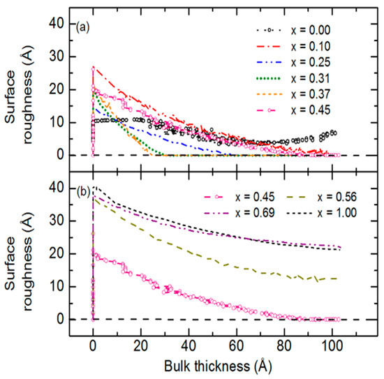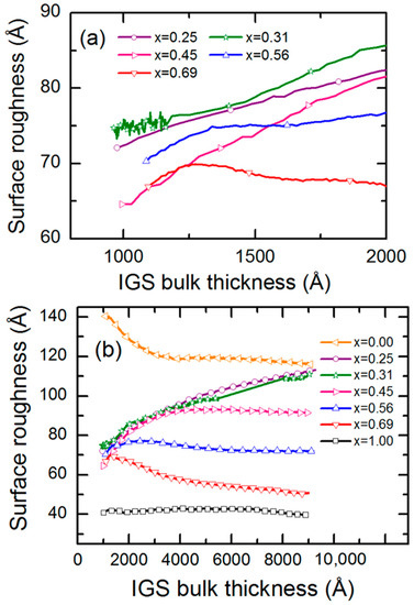 Figure 15 suggests that in a comparison of results for ~9000 Å thick IGS depositions of different compositions from Section 3.1, a reasonable approximation to the surface roughness evolution can be obtained over the bulk layer thickness range from 1000 Å to the end of the deposition using the (ε1, ε2) spectra deduced from multi-time analysis centered at 3500–4100 Å. Figure 16a shows these results for Ga compositions x = [Ga]/{[In] + [Ga]} selected for clarity over the bulk layer thickness range from 1000 to 2000 Å, and Figure 16b shows such results for a larger sample set and covering a wider range of bulk layer thickness to the deposition endpoint. For x ≤ 0.45, continuous roughening from 1000 to 2000 Å in Figure 16a suggests continuous crystallite evolution which generates growing protrusions at the surface, whereas for x = 0.69, a smoothening effect is observed, yielding a flatter surface characteristic of the stabilization of a fine-grained structure [53,54]. During the later stage of growth in Figure 16b, only the films with x = 0.25 and 0.31 show continued roughening throughout the growth process. All other films show either stabilized or smoothening surfaces at the end of deposition.