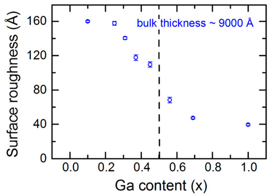 The multi-time approach as described in Section 3.1 was also used for the determination of (ε1, ε2) spectra at the endpoint thickness near 9000 Å for the IGS depositions of the composition series of Section 3.1. The endpoint surface roughness layer thicknesses deduced from these (ε1, ε2) spectra are presented in Figure 17. Although these results exhibit a clear monotonic trend with composition, they also tend to show different magnitudes over the two ranges of composition x ≤ 0.45 and x ≥ 0.56. In fact, the surface roughness thickness shows a more rapid decrease when the x value increases above x ~ 0.45, which is likely to suggest a rapid reduction in the grain size, leading to smaller, stable protrusions above the surface. It is of interest to consider the results in Figure 17, in view of the (ε1, ε2) spectra versus x in Figure 5 and also in view of the SEM images and XRD patterns of the IGS films in Figure 1, obtained for the same set of IGS films. The rapid change in structure above x = 0.45 in Figure 17 is consistent with the loss of the bandgap CP in Figure 5 and its replacement by a broad absorption onset typical of a disordered or nanocrystalline semiconductor. From the SEM images and XRD patterns, a strong reduction in grain size is observed between the available results for x = 0.31 and x = 0.56, which is consistent with the reduction in surface roughness in Figure 17.