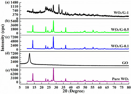 XRD patterns of pure WO3 and WO3/GR nanocomposites with different contents of GO. (a) WO3/G-1; (b) WO3/G-0.5; (c) WO3/G-0.1; (d) GO; (e) Pure WO3.