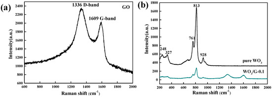 Raman spectra of: (a) GO; and (b) pure WO3 and WO3/GR-0.1 nanocomposite.