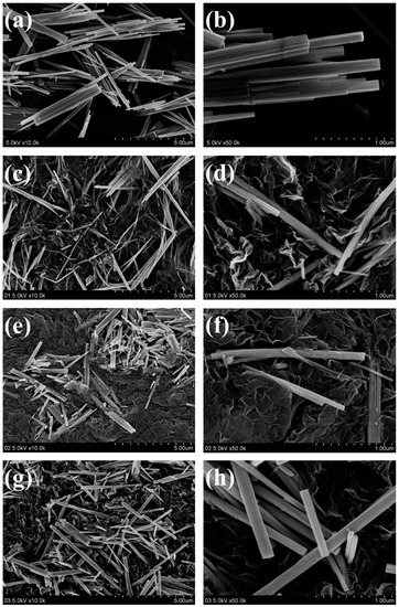 SEM images of: (a,b) WO3; (c,d) WO3/GR-0.1; (e,f) WO3/GR-0.5; and (g,h) WO3/GR-1.
