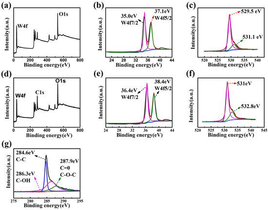 As a powerful surface analysis technique, XPS is often used to determine the surface elemental composition, valence states and molecular structure of as-prepared samples. Figure 5 shows the XPS results of pure WO3 and the WO3/GR-0.1 nanocomposite. The elements of C, O and W could be easily identified through the characteristic peaks of C1s, O1s and W4f. The survey spectra of pure WO3 (Figure 5a) and the WO3/GR-0.1 nanocomposite (Figure 5d) exhibited similar peak shapes; therefore, the sample needed narrower scanning. The high-resolution W4f spectrum for pure WO3 could be deconvoluted into two peaks at 35.0 eV and 37.1 eV, which were assigned to the W4f7/2 and W4f5/2 spin orbital splitting photoelectrons of the W6+ chemical state. O1s can be decomposed into two separate binding energies at 529.5 eV and 531.1 eV, corresponding to the surface lattice oxygen (Olatt) and surface adsorbed oxygen (Oads) [53], respectively (Figure 5b,c). In the WO3/GR-0.1 nanocomposites, the high-resolution spectrum of W4f are located at the binding energies of 36.4 eV and 38.4 eV, corresponding to the W4f7/2 and W4f5/2 peaks of the WO3 phase in the composite, respectively. Peak area ratio of these two peaks is obtained 0.75, which is in line with the 4f level theory of spin orbit splitting; its O1s XPS spectra can be deconvoluted into binding energy at 531 eV and 532.8 eV peaks, corresponding to the W–O bond and C–OH bond. In conclusion, the deconvolution signal of the binding energies of O1s and W4f in WO3/GR-0.1 composites is more intense and migrates to higher binding energy than pure WO3, it is probably due to the internal C, O and W elements of the interaction between the graphene and WO3, which is consistent with the results of Raman analysis. Figure 4 and Figure 5g is a high-resolution C1s spectrum of WO3/GR-0.1 nanocomposite; the three peaks are located at 284.6 eV, 286.3 eV and 287.9 eV binding energies, attributed to C–C, C–OH, C=O and C–O–C bonds, respectively.