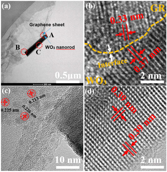 Figure 7 reveals the morphology of the WO3 nanorod and the WO3/GR nanocomposites. As shown in Figure 7a, it was clear that the characteristic WO3 nanorods were successfully synthesized through a one-step in-situ hydrothermal reaction. Taking the WO3/GR-0.1 nanocomposite as an example, a one-dimensional WO3 nanorod was spread on the surface of the two-dimensional graphene nanosheet. The HRTEM images of regions B and C (Figure 7b,c) show the interfaces of the WO3 nanorod and graphene nanosheet. The results indicated that an intimate interfacial contact between them was readily synthesized by such a simple hydrothermal reaction approach. The d-spacing of the lattice plane (001) near the interface in Figure 7b became smaller as the interface was approached. Some stacking faults and dislocations were also observed at the interface. The HRTEM image of region C (Figure 7c) shows the different lattice structures around the interface between WO3 and graphene. The d-spacing of these lattice planes was in the range of 2.13 Å to 2.26 Å. Figure 7d shows the standard lattice plane (001). The result means that the lattice structure inside WO3 was not affected by the graphene or the interfacial energy.