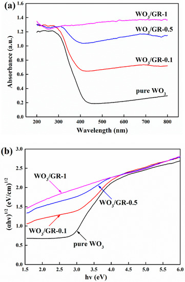 (a) UV–vis diffuse reflectance electronic spectra of pure WO3 and the WO3/GR nanocomposites; and (b) the relation curves of hv and corresponding (αhv)1/2 of the as-prepared samples.