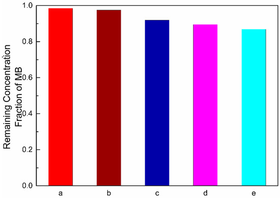 The remaining methylene blue (MB) in solution equilibrated with: (a) no catalyst; (b) pure WO3; (c) WO3/GR-0.1; (d) WO3/GR-0.5; and (e) WO3/GR-1 after stirring in the dark for 60 min.