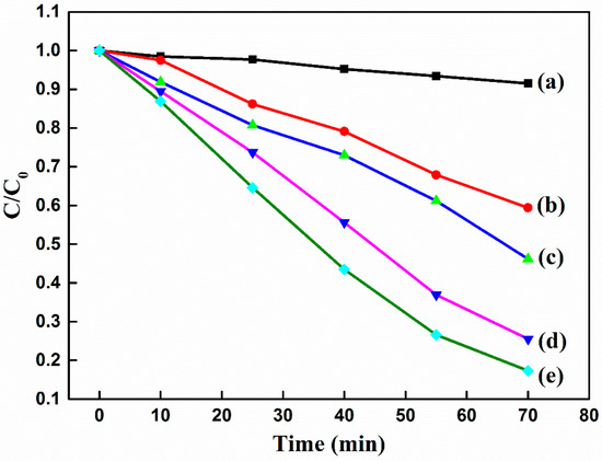 Photodegradation of MB under visible light: (a) no catalyst; (b) pure WO3; (c) WO3/GR-0.1; (d) WO3/GR-0.5; and (e) WO3/GR-1.