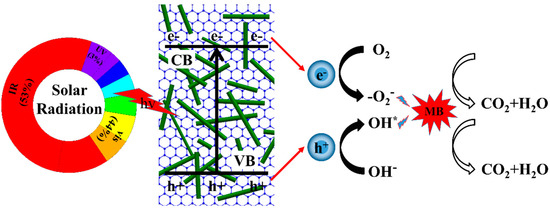 Figure 11 illustrates the mechanism of the photocatalytic degradation of MB by the WO3/GR nanocomposites under visible light irradiation. In the solar spectrum, the energy distribution in the ultraviolet spectrum almost disappears (UV light below 0.29 m is almost all absorbed), and only approximately 3% remains. The infrared spectrum occupies 53%, while the visible spectrum accounts for 44%, which is nearly half of the solar energy. Under visible light irradiation, hv (vis) ≥ Eg. The electron in WO3 acquires enough energy to generate electron–hole pairs; consequently, the WO3 electron in the valence band is transferred into the conduction band of graphene. These electron–hole pairs undergo reduction-oxidation reactions, where the valence band hole is a good oxidant and the electron in the conduction band is a good reductant. Owing to the high carrier mobility of graphene (20,000 cm2 V−1 s−1) and its 2D conjugated structure, the introduction of graphene behaves as an electron acceptor. Therefore, the efficiency of the electronic separation is enhanced. The rate of recombination of the photogenerated electron–hole pairs is inhibited. This results in an improvement of the photocatalytic efficiency for the WO3/GR nanocomposites. The process can be written as: