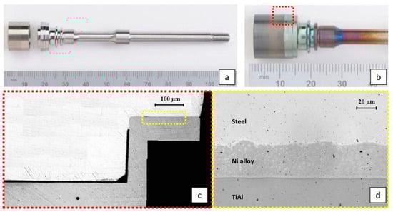 (a) TiAl cylinder and Steel shaft before the assembly; (b) TiAl cylinder and steel shaft after the assembly; (c) longitudinal section of the joint; (d) optical microscope image of the joint.