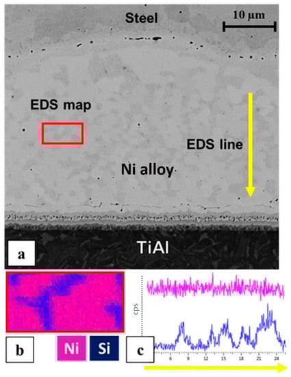 The optical microscope observation (Figure 1d) evidenced an inhomogeneity in the filler layer, showing brighter areas within the filler material and at the interfaces with the TiAl and steel. The observation of the sample with SEM (Figure 2a) confirmed this inhomogeneity; specifically, the EDS line and EDS map analyses (Figure 2b,c) highlighted the presence of silicon-rich areas, which are responsible for the darker spots in the intermediate Ni layer.